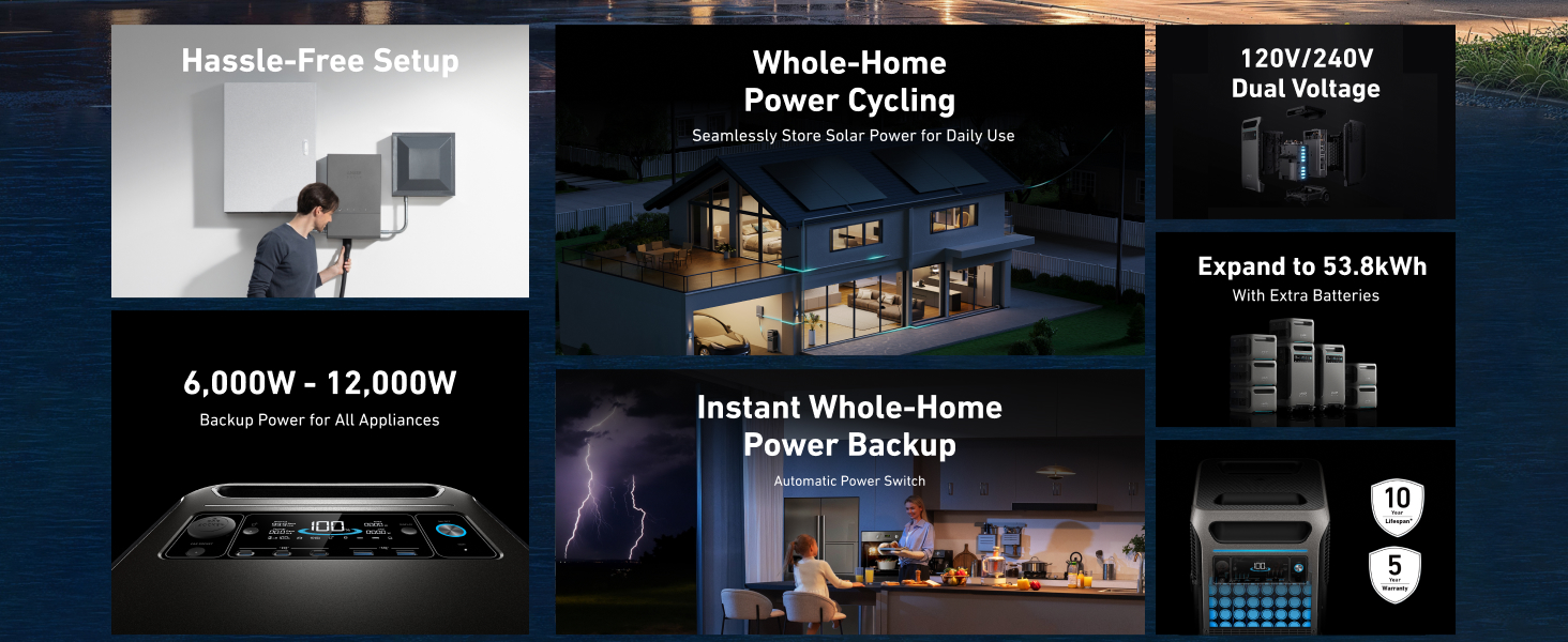 Pros:Powerful enough to run our whole house for ~ six+ hours (w/out AC/oven, or two+ hours with oven).Safer/Cleaner/More Convenient alternative to gas/propane generatorExpandable, so with a second Anker battery, the whole house is powered for ~ 12 hours, and with a third unit for 18 hourswithout recharging the battery.Sturdy/good build quality – The Unit can be safely lifted with the handles.Wheels & retractable handle make it much more portable and easier to take camping, or to move to different locations on the property.Solar charging is simple with Anker’s folding solar panel kit.Anker’s Smart Home Power Kit allows for a grid power connection.With the installation of the Anker Smart Home Power Kit, the Anker battery can be charged using rooftop solar panels.Can reduce monthly electrical bills from the grid year-round:Bluetooth App monitors battery level to automatically switch betweenGrid power & Anker power during peak (higher cost) hours (when used with Smart Home Power Kit).The Anker can also be charged during off-peak hours to contribute to lower electric bills.No need to store propane/gas as with propane/gas generatorsCons:Because the 240V plugs are disabled during charging, the Anker can’t be recharged with a generator or AC power while in use with 240V (whole house), but there are 120V outlets available during recharging to power large and small appliances (fridge) and run/recharge computers, phones, etc.Purchase of Anker’s Smart Home Power Kit, plus, installation by an electrician, is required to set up charging from rooftop solar.One must find an electrician familiar with or willing to set up Anker’s Smart Home Power Kit with existing rooftop solar panels.More expensive initial cost